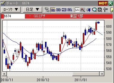 そんな中、これも読者コメントで指摘して頂いていた「GSユアサ(6674)」は、壺にはまった動きとなりました。