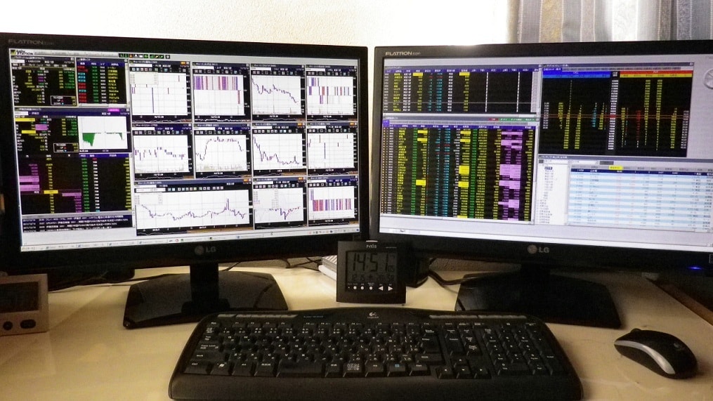 デイトレーダーというと、右のようなマルチモニターでデイトレするもののように考えている人も少なくないでしょうが、私はずっとノートパソコン3台でやってきました。